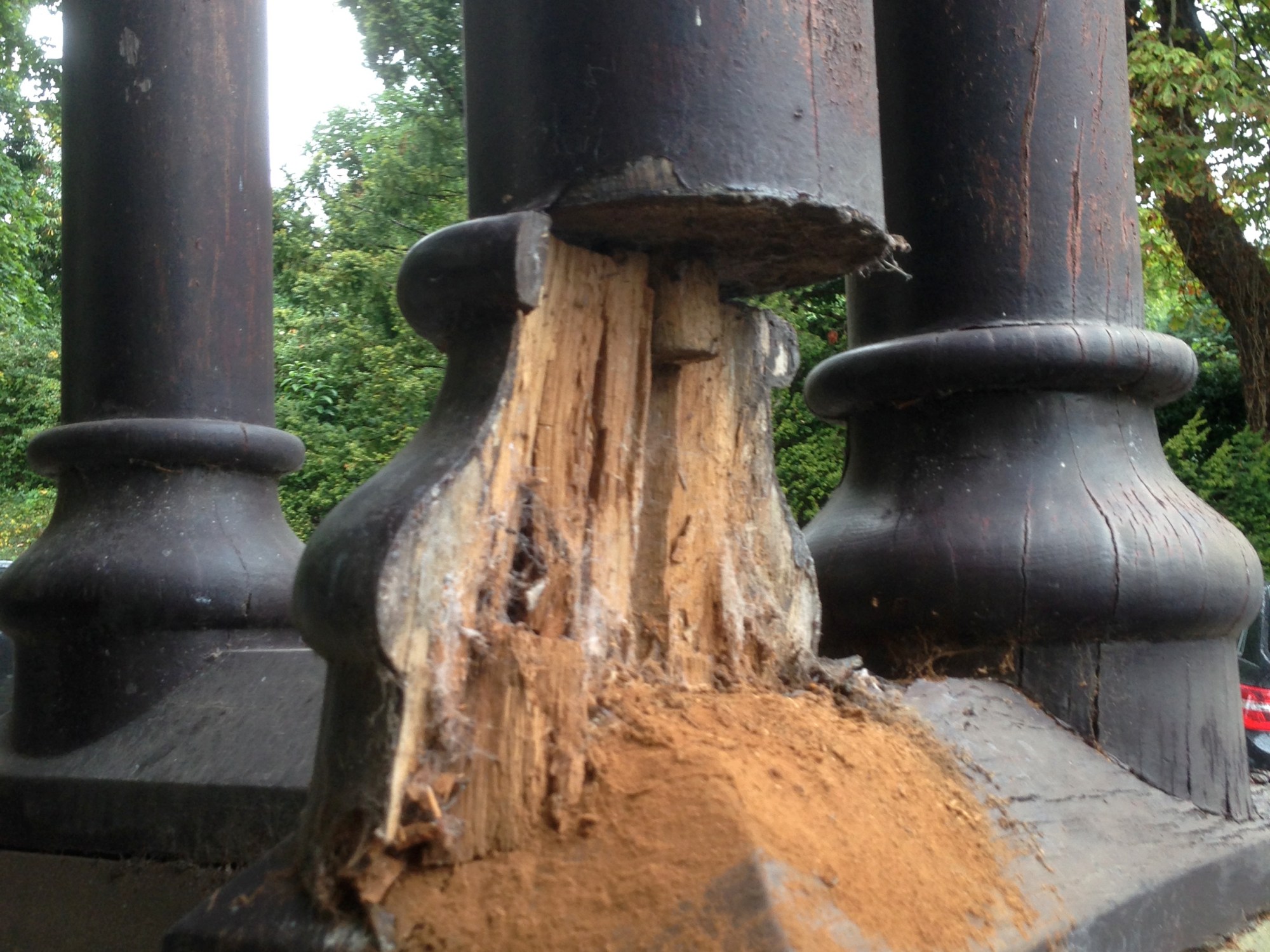 No wonder we where scared. So what did we do? First got scaffold put up to support the porch, then worked out a plan with the help of our engineer. We then made six new blanks to turn the 300x300mm column bottoms. We built these Jenga style out of smaller Douglas Fir ‘bricks’ but with a hollow in the middle then glued and clamped them and put them in a press with 4 tonne of pressure. These were then turned by local turner John White. Meanwhile we made the plinths. It was then a relatively straightforward but neverless nerve racking job of removing the ‘compost’ column supports and sliding in the new ones and pinning them in place