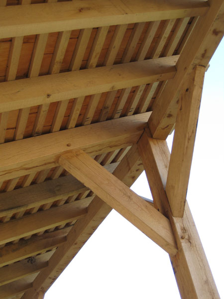 For this we developed a more complex version of the traditional jowl post. It was complicated to make and difficult to draft and finish in each plain. We first made a scale model of the junction and then had full scale templates of each part to test them all fitting together. Eight years on and it seems to be doing fine. However, retrospectively I wonder if a steel node with flitch plates for each timber might have been a more straight forward and quicker to make solution.