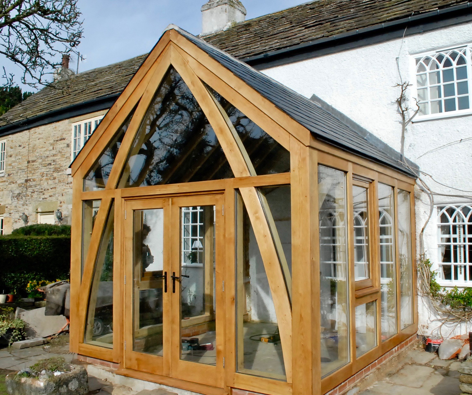 Just finished a conservatory for local private customer, a stones throw from our workshop. After much discussion and sharing of images we chose a cruck design which mirrored the detail in the windows of her very old and quite dark farmhouse. The conservatory replaces a plastic one which was past its best and we are sure the new one will become her main dwelling space, particularly as it opens south into the lovely garden.