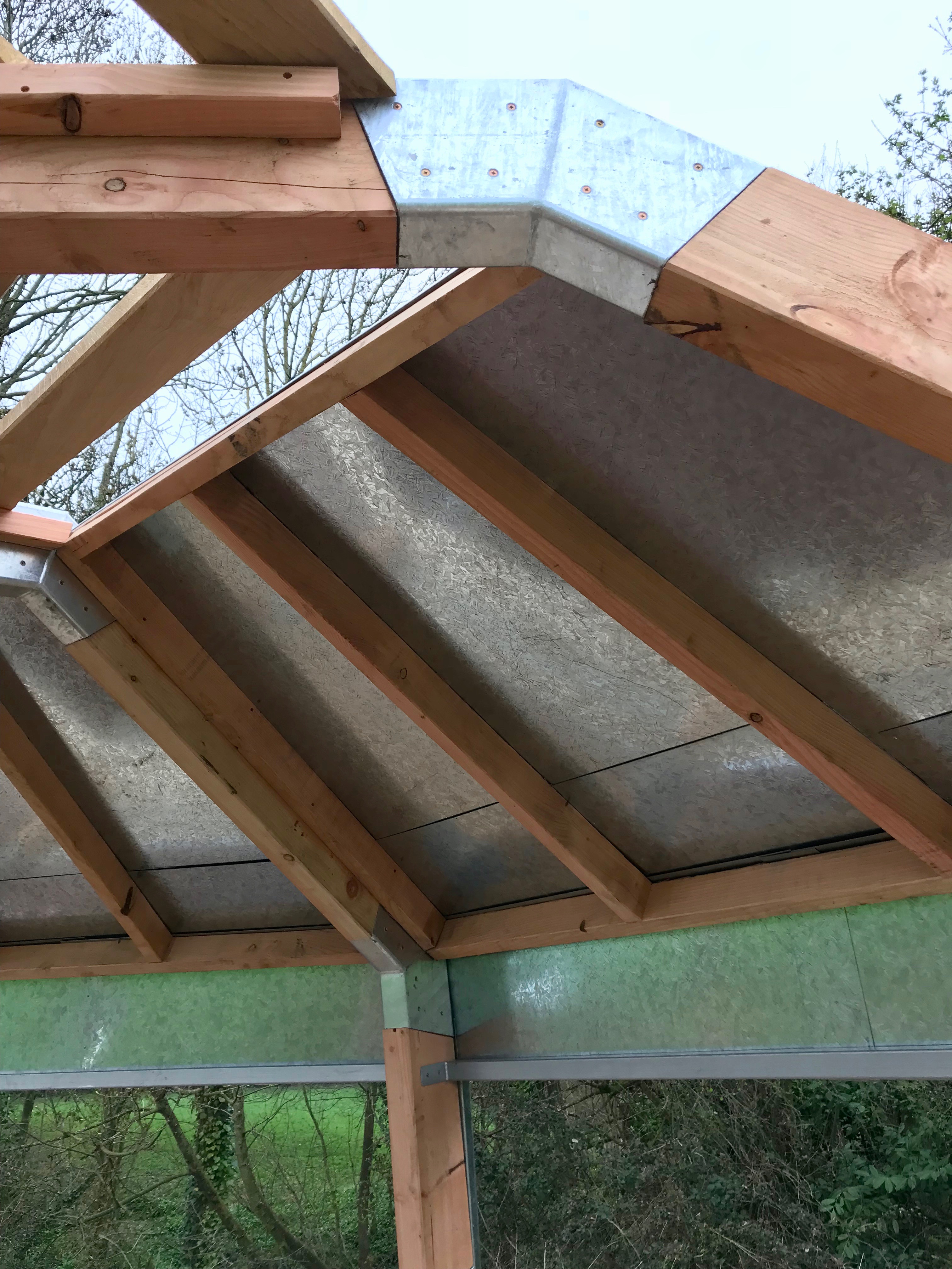 Galvanized steel structure, air-dried English Oak detailing, stainless steel fixings