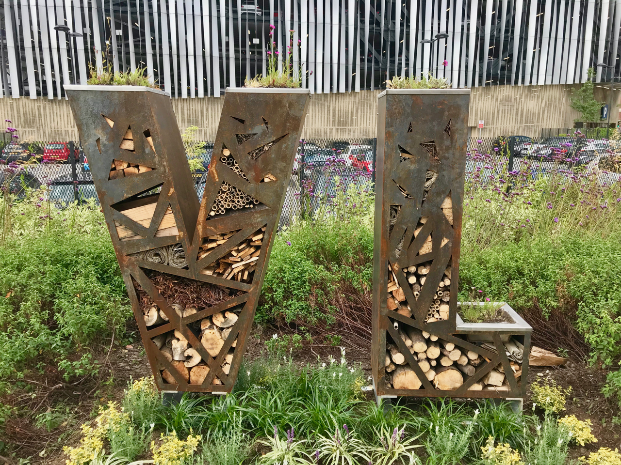 Recently installed outside Victoria Leeds Shopping Arena in Leeds City Centre. The letters are made from laser cut coreten steel, and so will change colour over time. Inside we filled them with a combination of paper and wood post consumer waste and natural materials to encourage insects to make a home. They are topped with mini wildflower greenroofs.