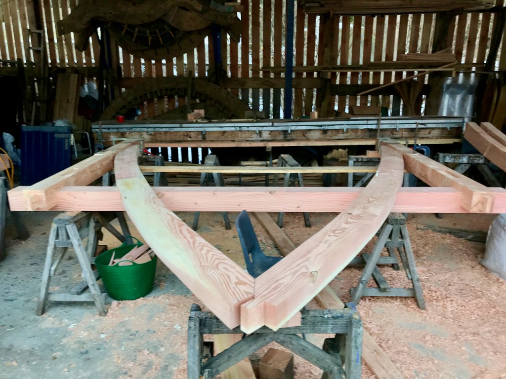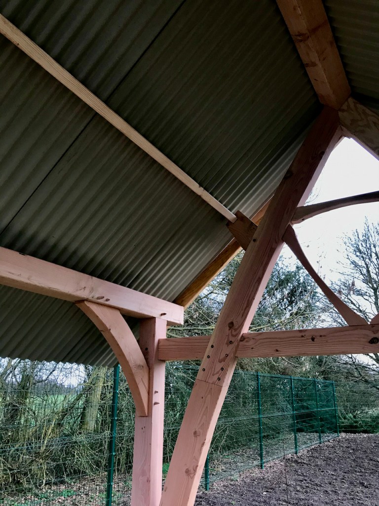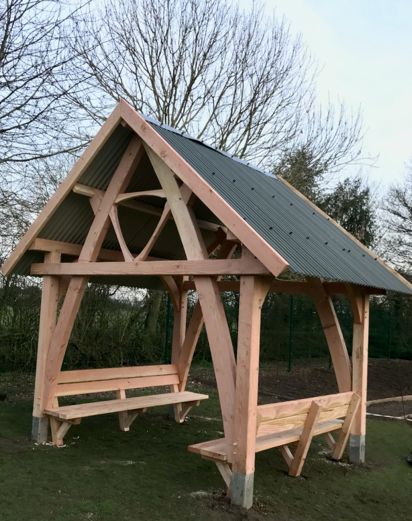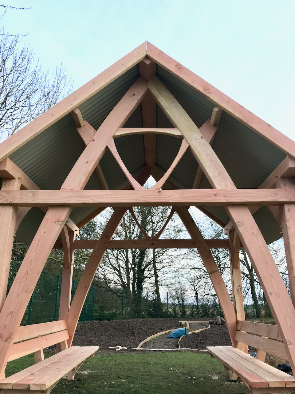 Based on a traditional ‘Crucked’ Barn design, this shelter is part of our ‘youth shelter’ range and provides covered outside space between a growing area and peace garden to the secondary school students at Pilgrim Special School in Boston, Lincolnshire. Douglas Fir frame and powder coated corrugated steel roof. Steel box section shoes to keep the posts out of the ground. Draw doweled mortise and tenon joints throughout.
