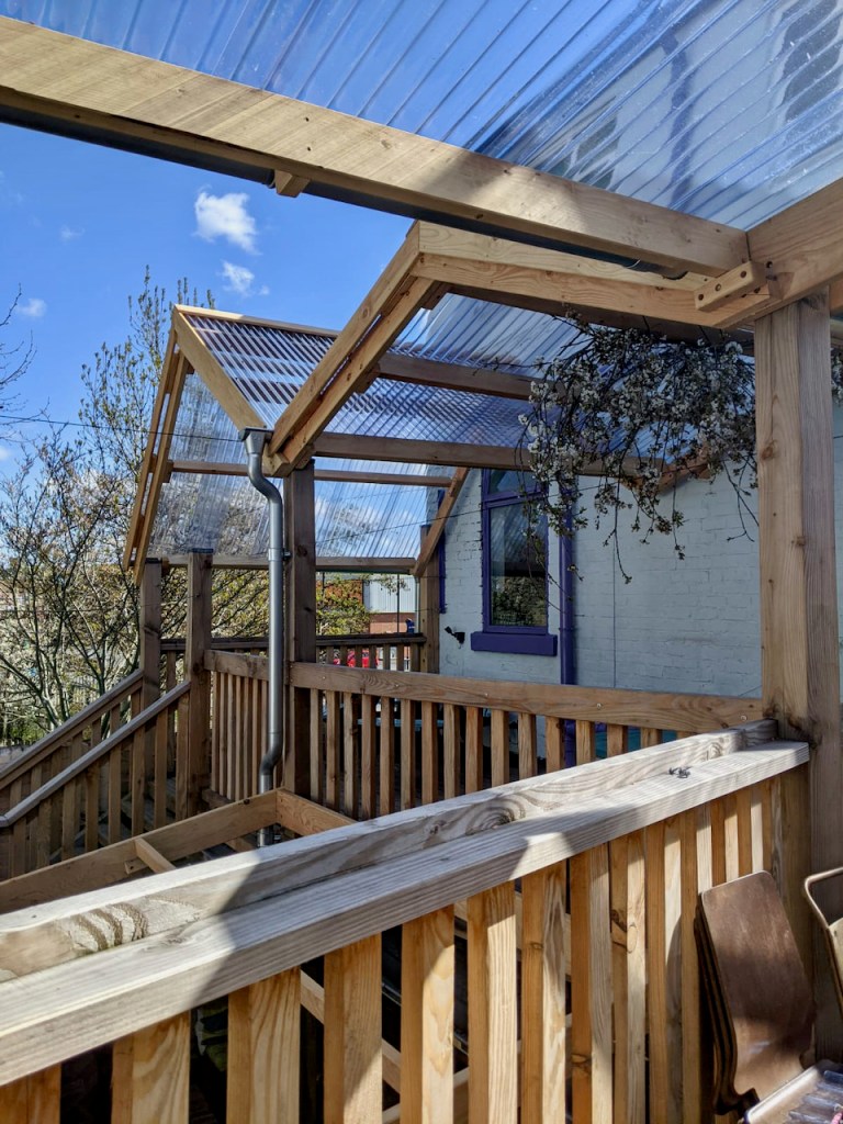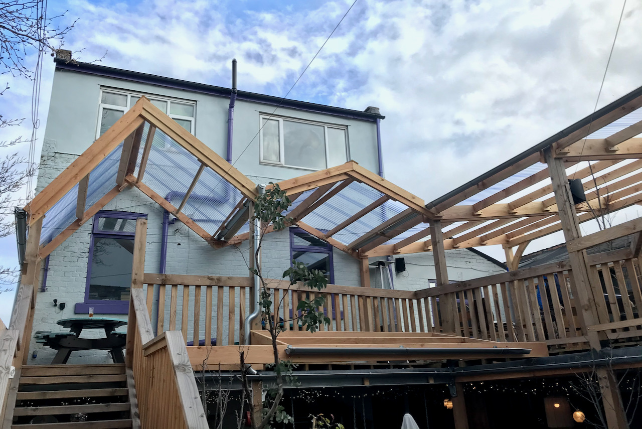To make the mezzanine we installed in 2020 more usable year round, and particularly with the current need for outdoor entertaining we have added a roof to the Hagglers Corner frame. To complement the rest of the structure its got lots of angles and a combination of traditional timber framing and screwed connections. A nine metre post and beam fronts the upper bar wall with draw doweled mortise and tenon joints, braces and wedged tabled scarf joint. The purlins and rafters are connected with coach screws and the double pitch roof spills into valleys created using steel gutters.