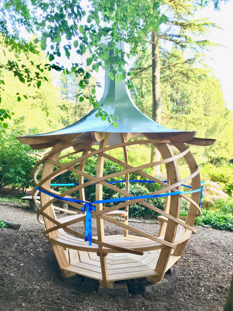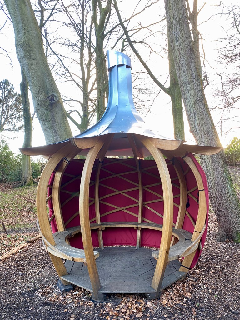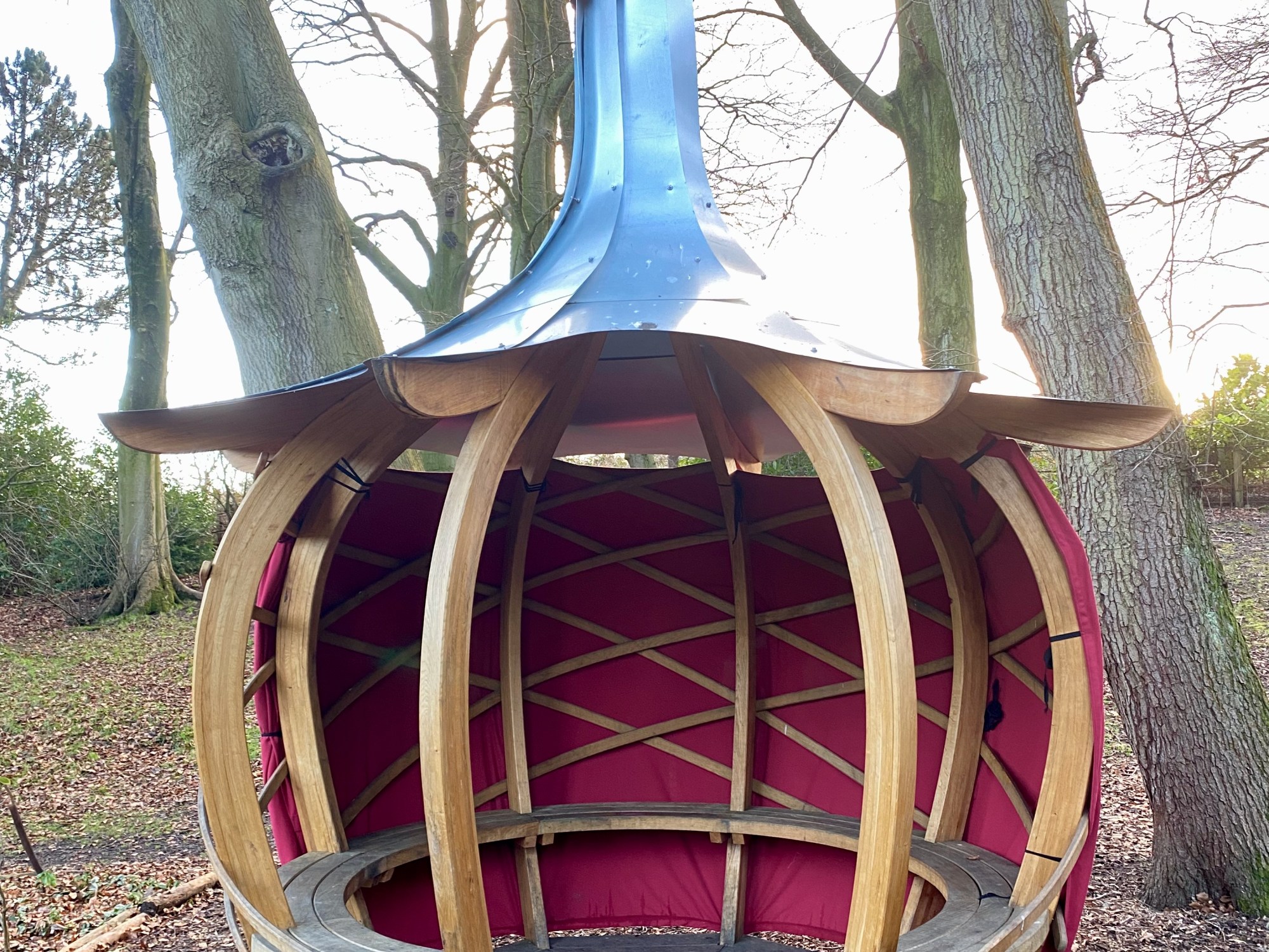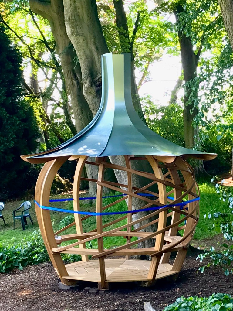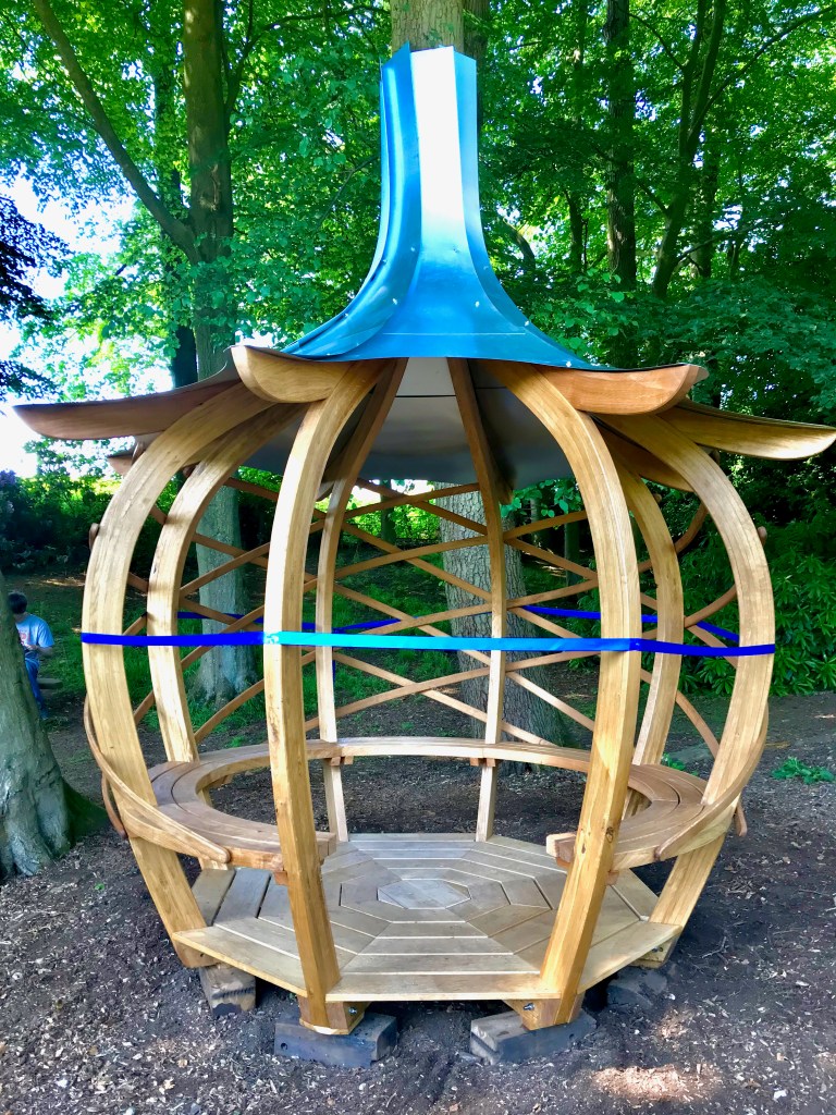 Just installed the permanent Onion Shelter at Whirlow Brook Park in the remembrance garden, managed, and funded by the University of the Third Age [U3A]. This has curvy steam bent cladding around the eight laminated ribs, seven curved seating bays and floor all in oak, and then topped with a galvanized steel roof. Around the rear of the shelter we have added an adjustable canvas screen to project it from the prevailing wind. Just in time as the larch plantation forest behind has just had to be clear felled as it had a fungal disease. The good news is that it is going to be replaced with a native broad leaf wood, part planted and part self generating.