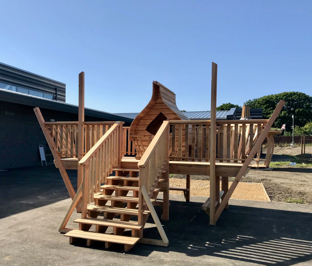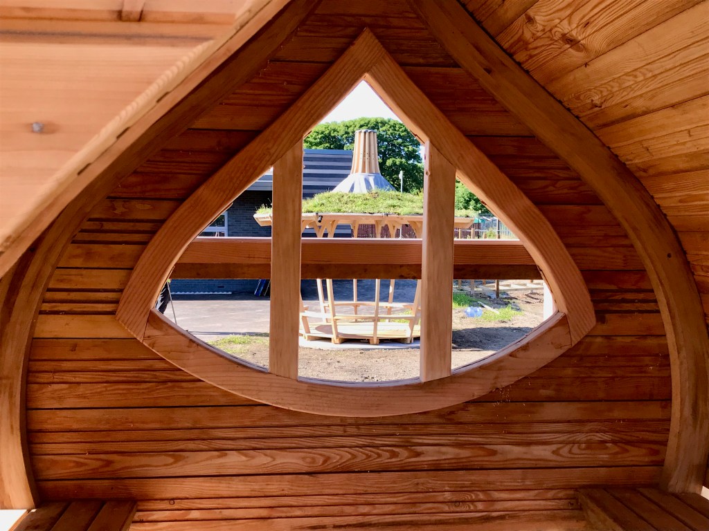 Mini Onion Play Shelter on top of a platform with seating underneath. Stage all made from UK Douglas Fir, Onion steambent Oak frame, seating and floor with Siberian Larch cladding. We added grip strips to the stairs for safety and handrails all the way around.