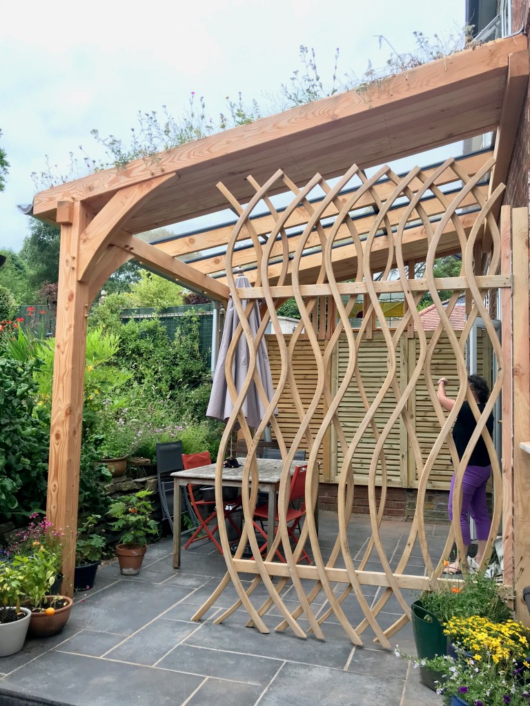 Douglas Fir frame with draw doweled joints and toughened glass in a glazing bar system. Galvanised Steel gutters and the wavy screen is steam bent glue laminated oak.