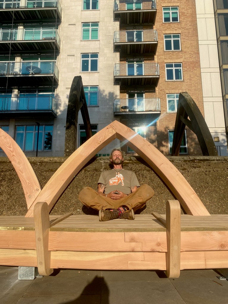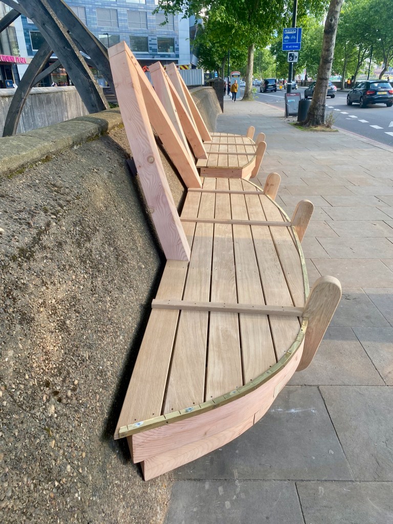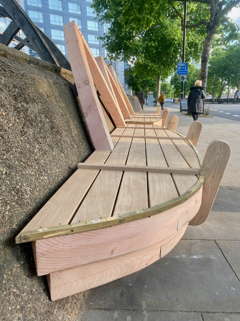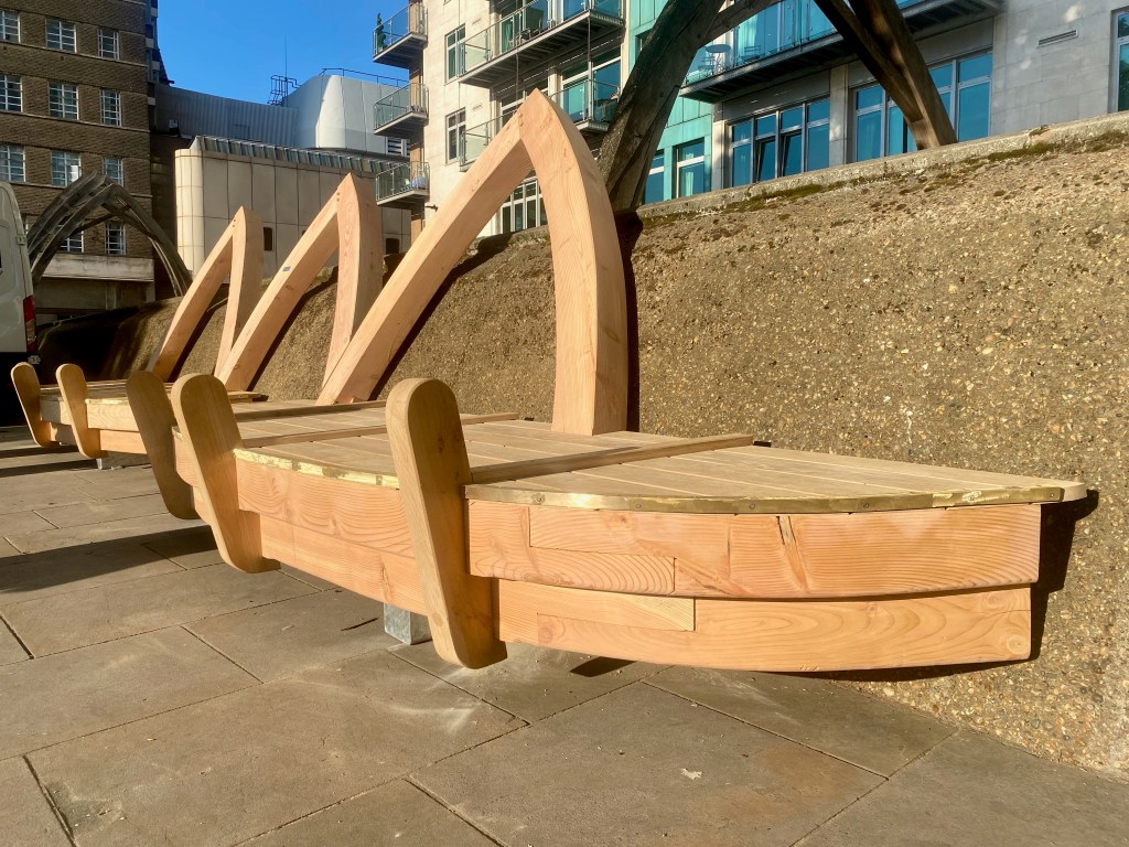 Boat Benches, White Hart Dock, Albert Embankment, central London. Continuing from our public art installation in 2007 the boat benches offer weary travelers and busy commuters the opportunity to take a moment to rest on the sunny south side of the River Thames. Standing on them you can peer over the wall and see the daily ebb and flow of the river that still fills White Hart Dock and our series of huge oak arches that span it.