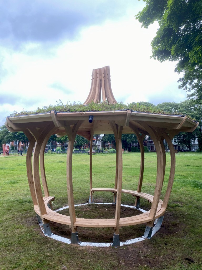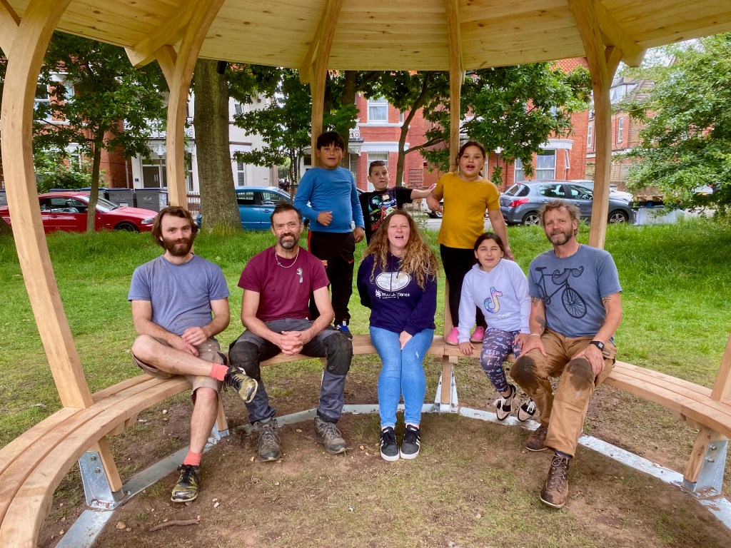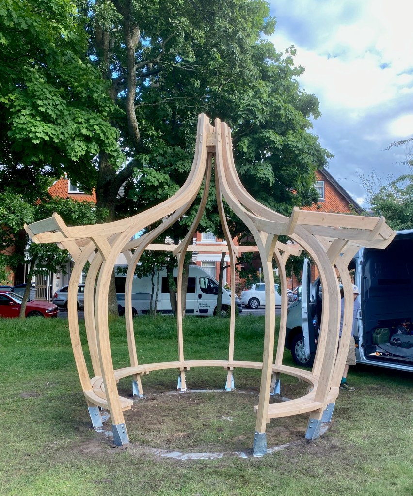 Chruchhill Gardens, Boscombe is a very well used community park, with their own community engagement facilitator. This is part of the Aspire project – a pan European health and wellbeing initative, and C3 Collaborating for Health. The local community asked for a shelter as part of their community action plan as a space to rest, relax and connect with others, and Handspring’s Large Onion was chosen to for this purpose. As soon as we arrived on site the local community where involved and we had lots of help with digging in the base, and a constant stream of people all day coming to see how we where getting on.
