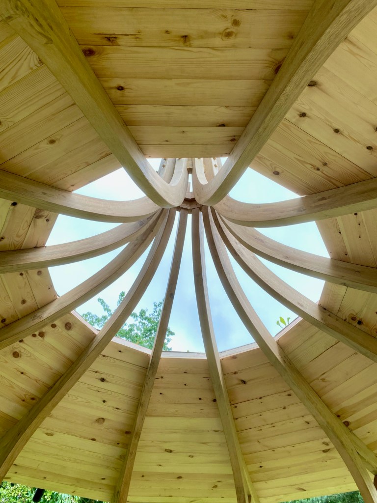 Level access was requested and so we made a change to the usual oak base of the shelter, and designed a steel ring beam with brackets to take the ribs. This ring beam was set flush with the grass, and has four anchors buried deeper into the ground, avoiding the need for any concrete. This will feature again on a number of up coming shelters, and adds a durable robust base option to the Apple and Onion Shetler range. The roof was also left open in the center to stop the space being used in all weathers, and it also allows the ribs to rise up through it and finish with a flourish as an ‘eye of heaven’ or ‘wheel to the stars’. As with lots of our projects a wildflower meadow was added to the top, adding in nature whenever possible.