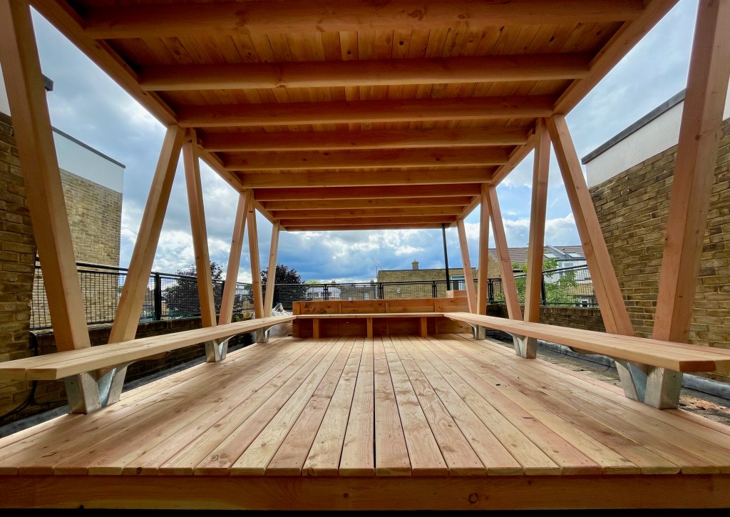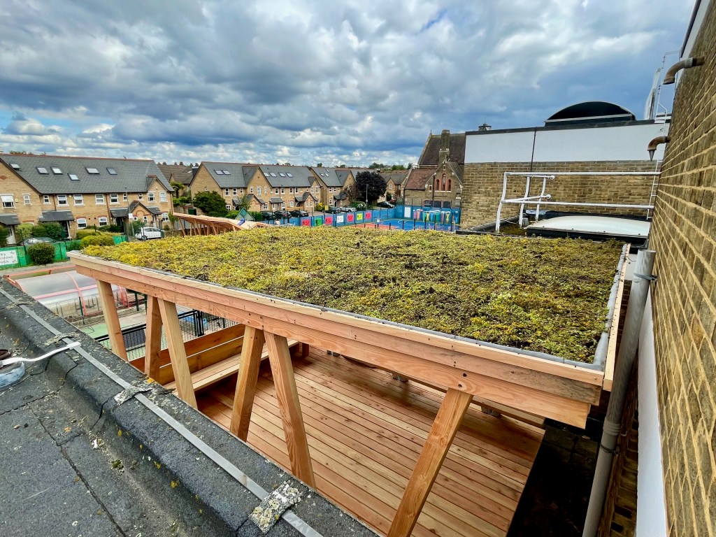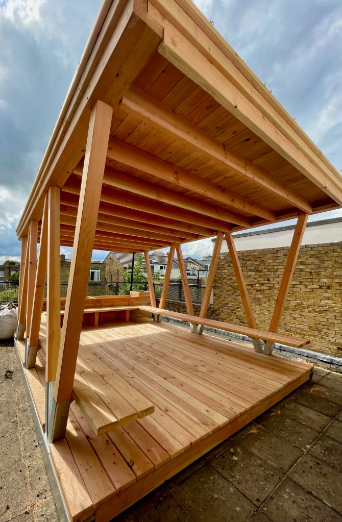 As part of a funded sustainability improvement package the school have asked us to make a number of outdoor classrooms. The first two are 6x4m on plan with benches on three sides and are located on two unused roof spaces on opposite sides of the school. They offer covered outdoor learning and breakout spaces for the music room and another teaching space