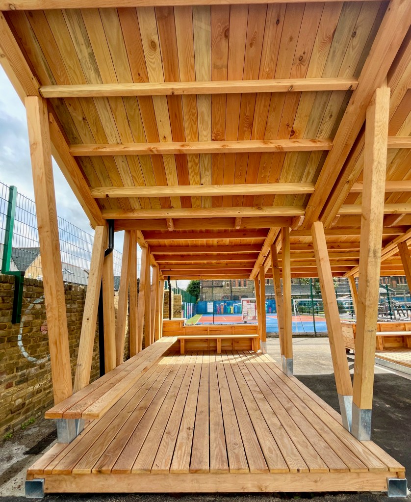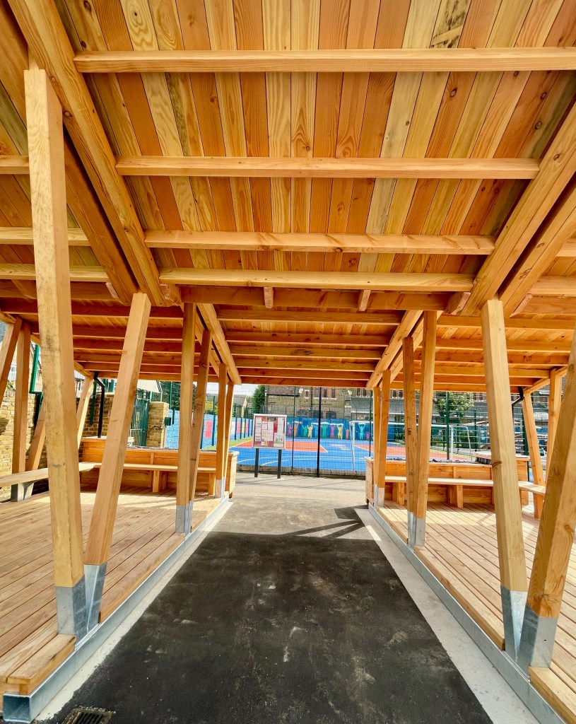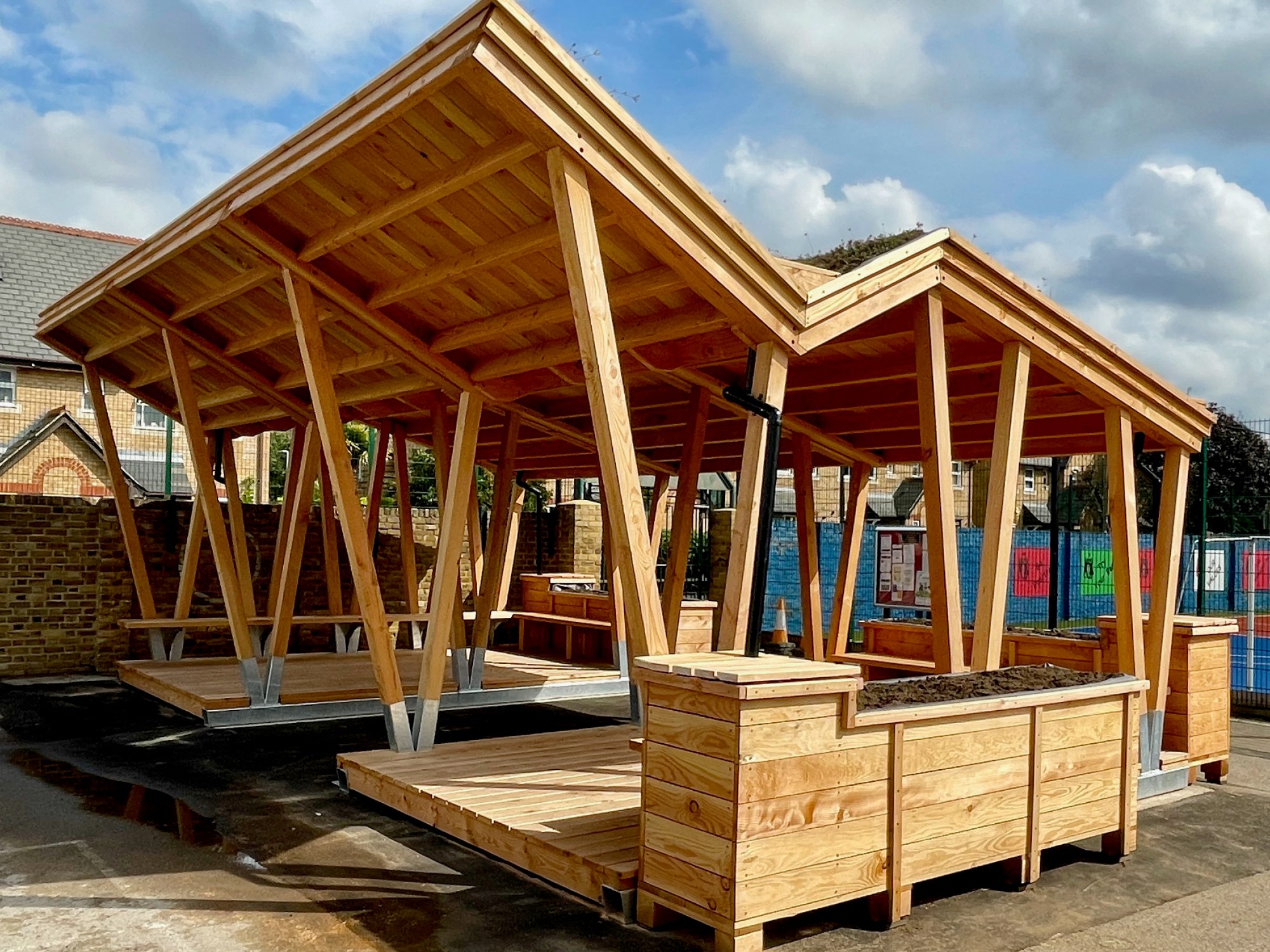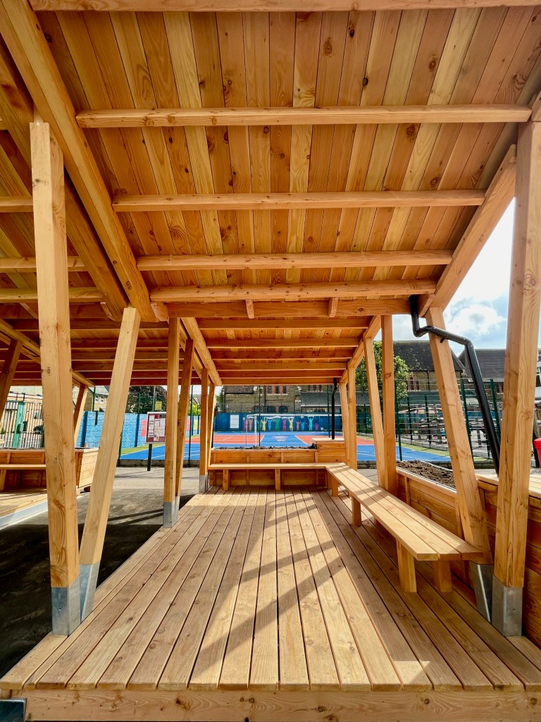 The lightning strike shelter provides a covered playground space for a multitude of uses for pupils, parents and staff whilst also offering a home to nature and reducing storm water flooding.