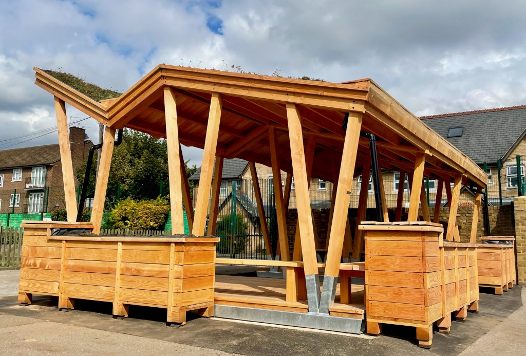 The shelters, benches and planters are entirely constructed from UK sourced freshly sawn Douglas Fir timber with a galvanised steel base to provide the structural support and keep the timber away from the damp zone at ground level.