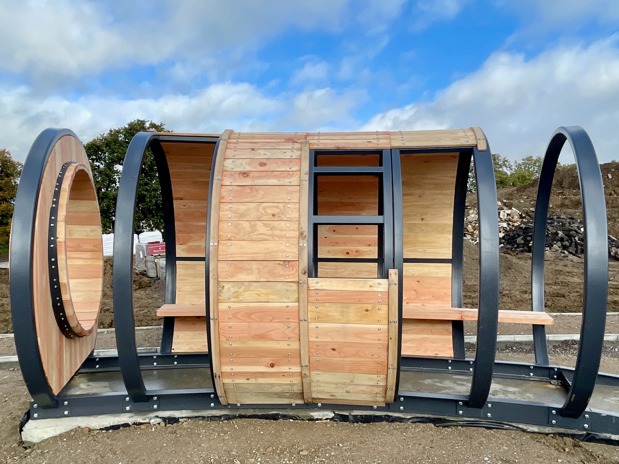The Hoop for this project has been slightly redesigned, with more cladding around the front and without the fins that have previously projected infront and behind the shelter. We have also increased the Douglas Fir timber cladding and added some steambent oak details to the edges of the cladding.