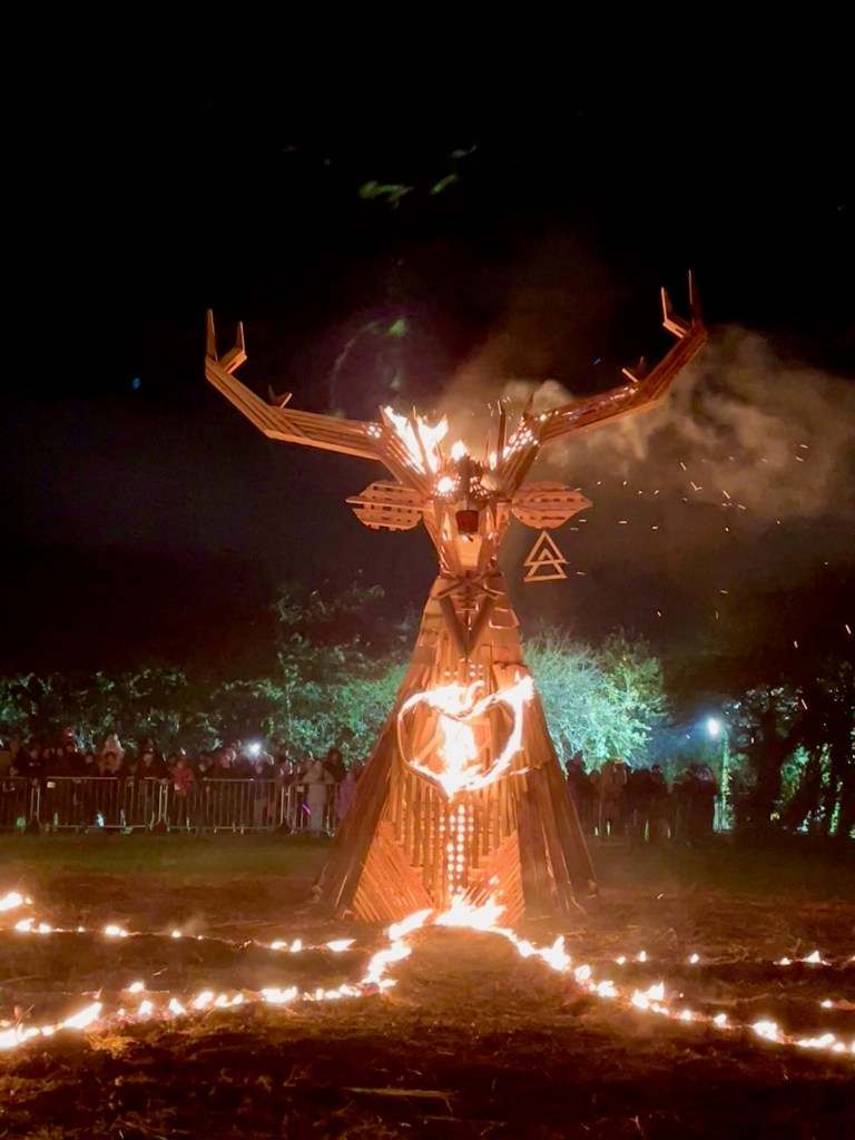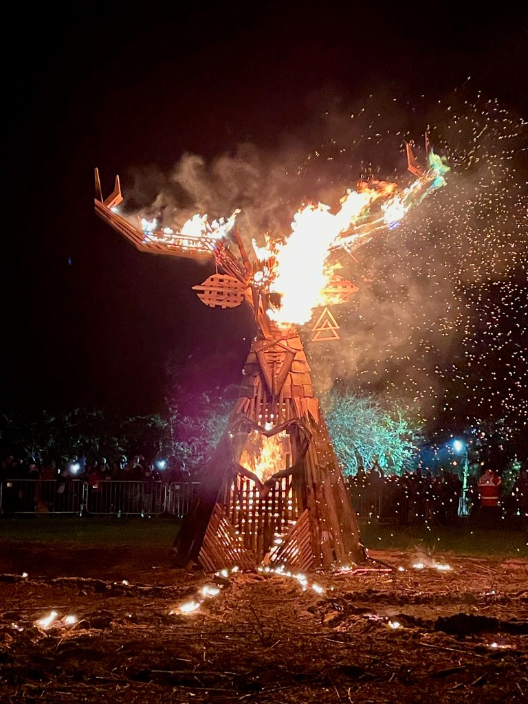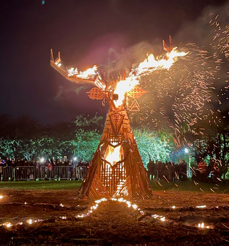 Fire sculpture for Manor and Castle Development Trust’s Annual Bonfire event organized by the team at Green Estate, Sheffield. Once upon a time the Manor was a deer estate and so the idea of a majestic stag standing over all who dared to come was born. Bringing some of the Burning Man asethetic into the dark peak winter, and designed to burn from the antlers down and the heart out. The entire sculpture was made from transportation packaging – the wooden bearers and stickers we get with our timber deliveries from the sawmill and broken up scrap pallets from deliveries of other materials. Over twenty person days of creativity went into the construction, a a few more into the design, all happily gone up in fire and smoke within an hour. Over 5500 people dared to come and were also treated to a spectacular firework show on a rare fine November day.