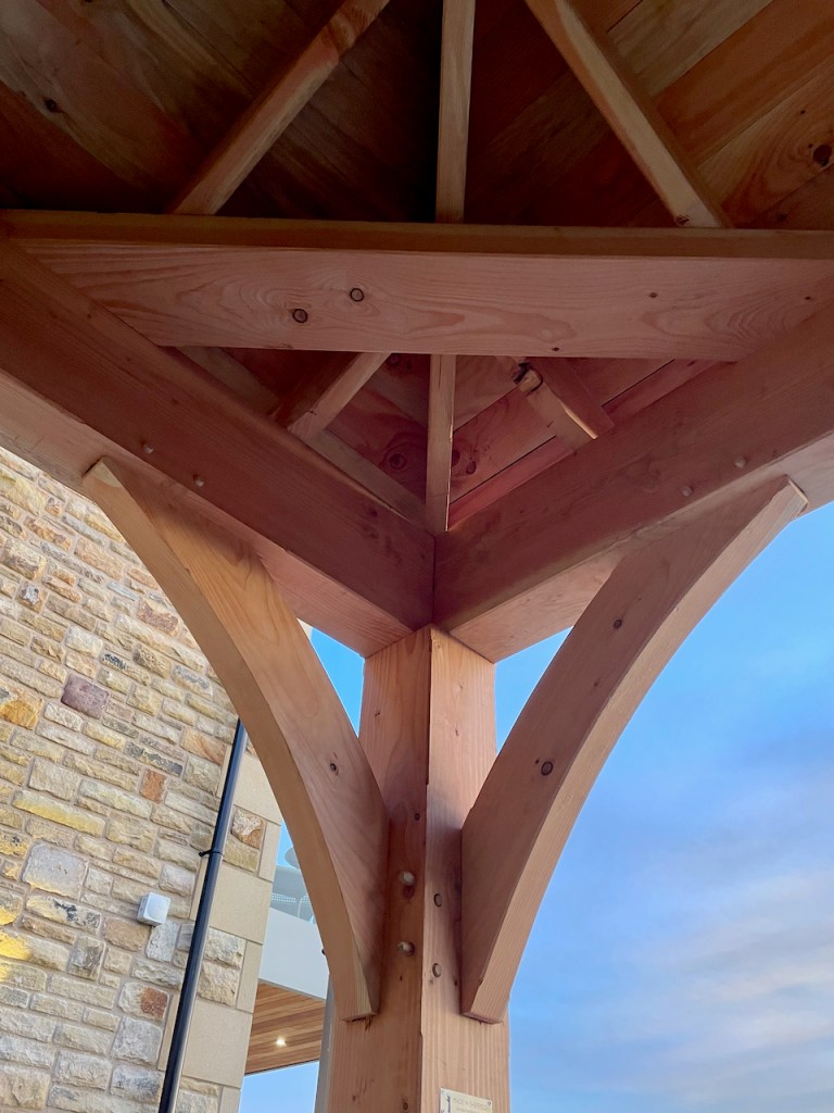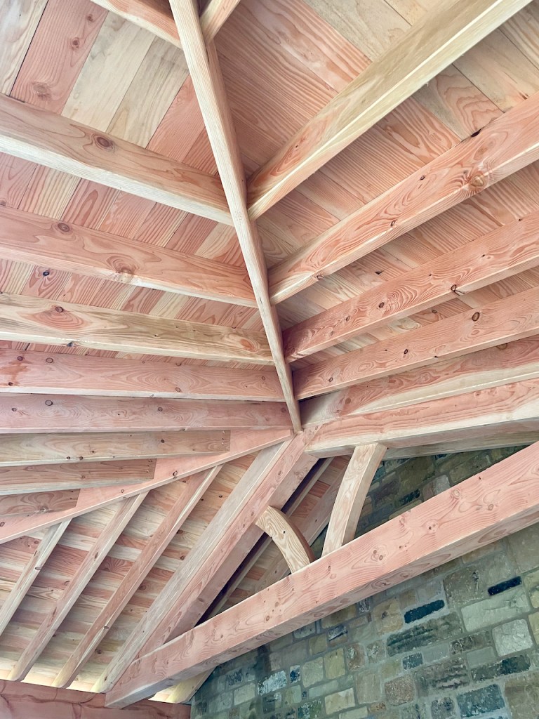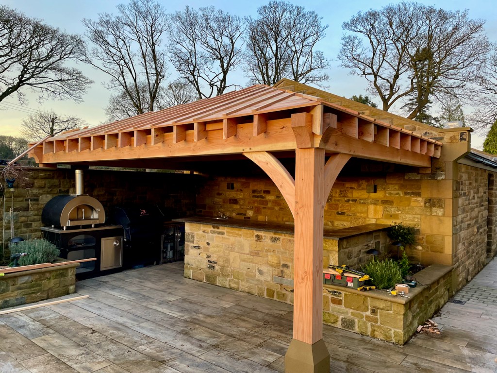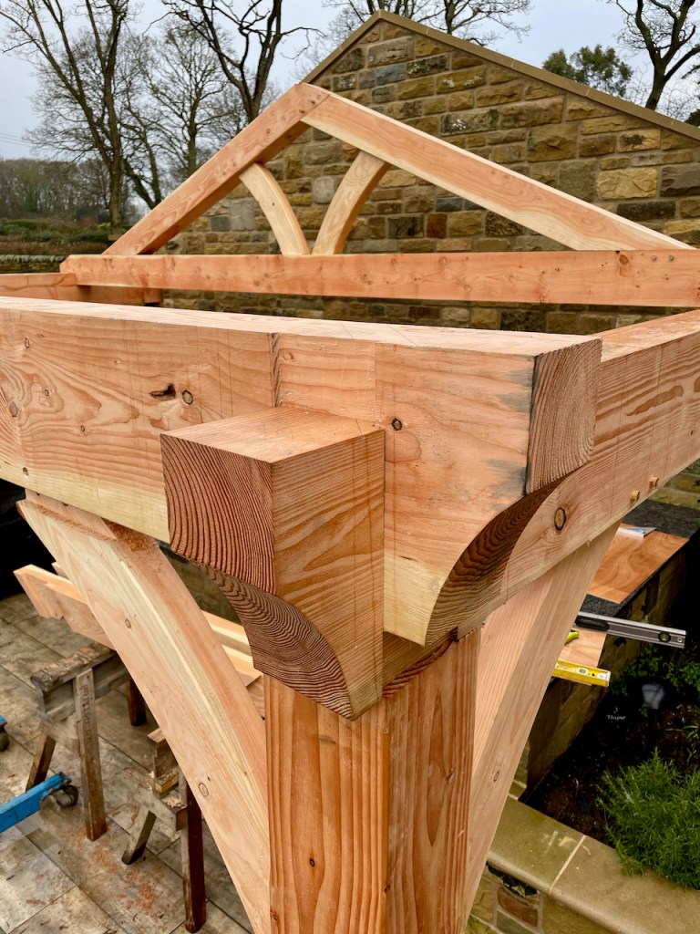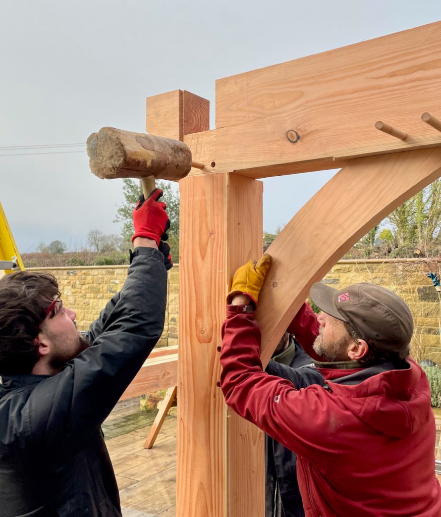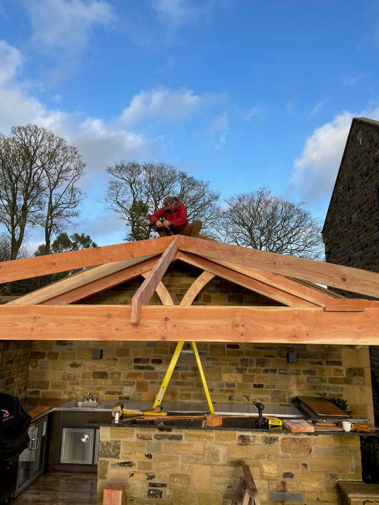 The last project of 2023 was making and installing a hipped roof, queen post truss Douglas Fir timber frame over an outdoor kitchen. The spans where fairly large at over six metres so we used some hefty beams and big joints to put the frame together, then over boarded the top, ready for a slate roof.