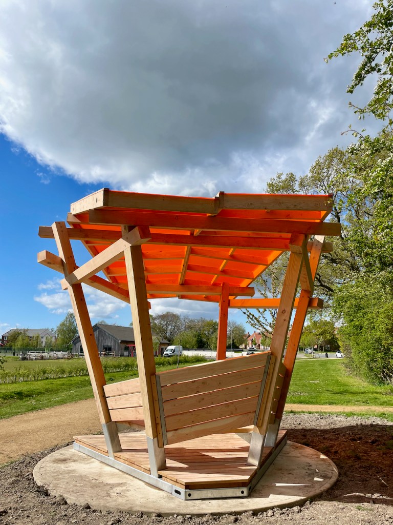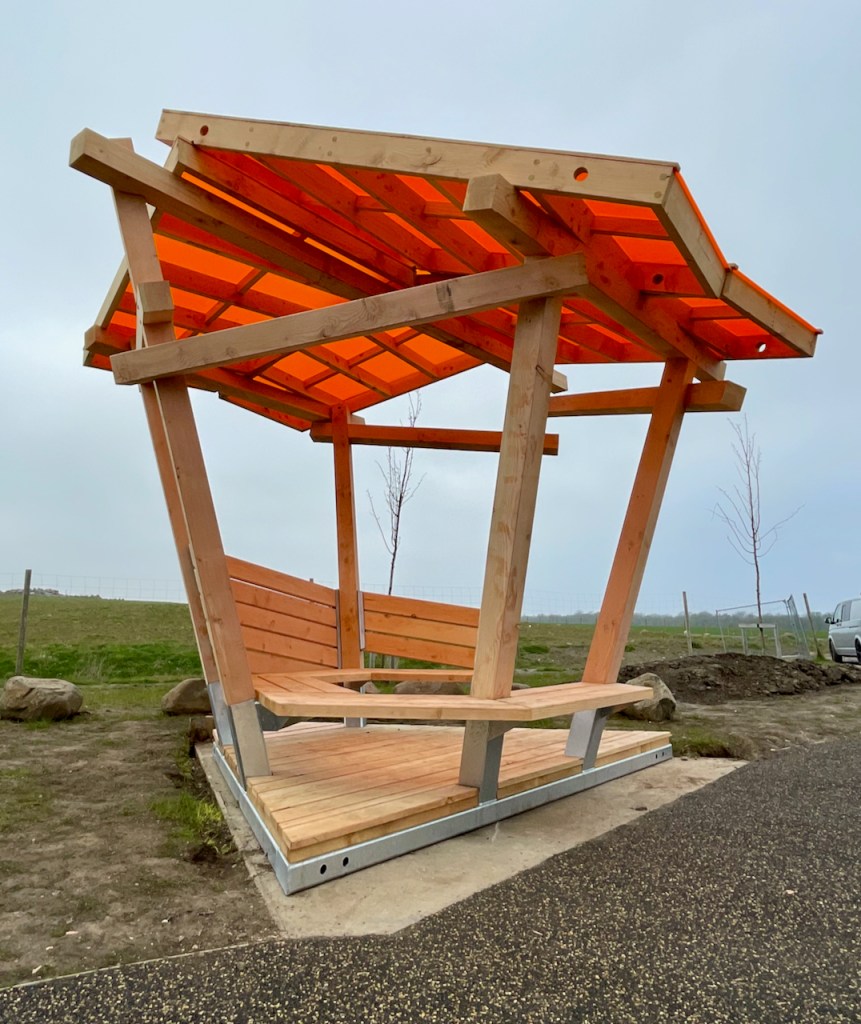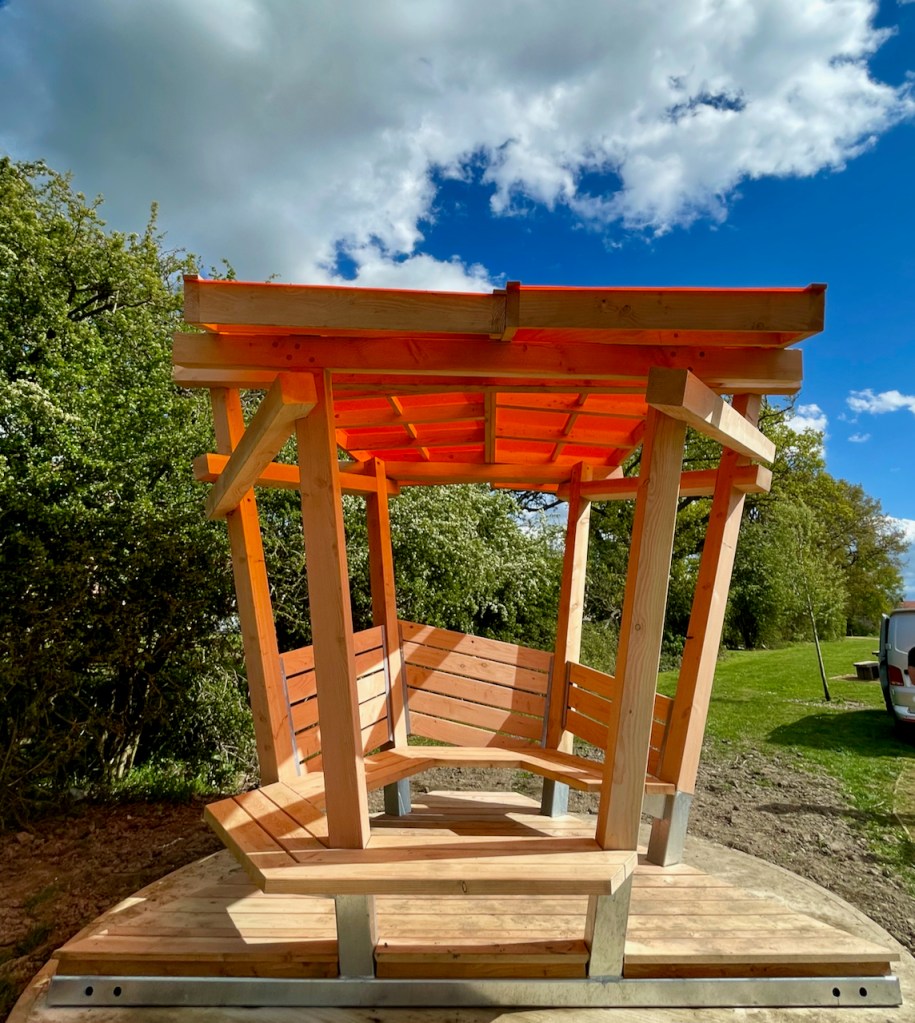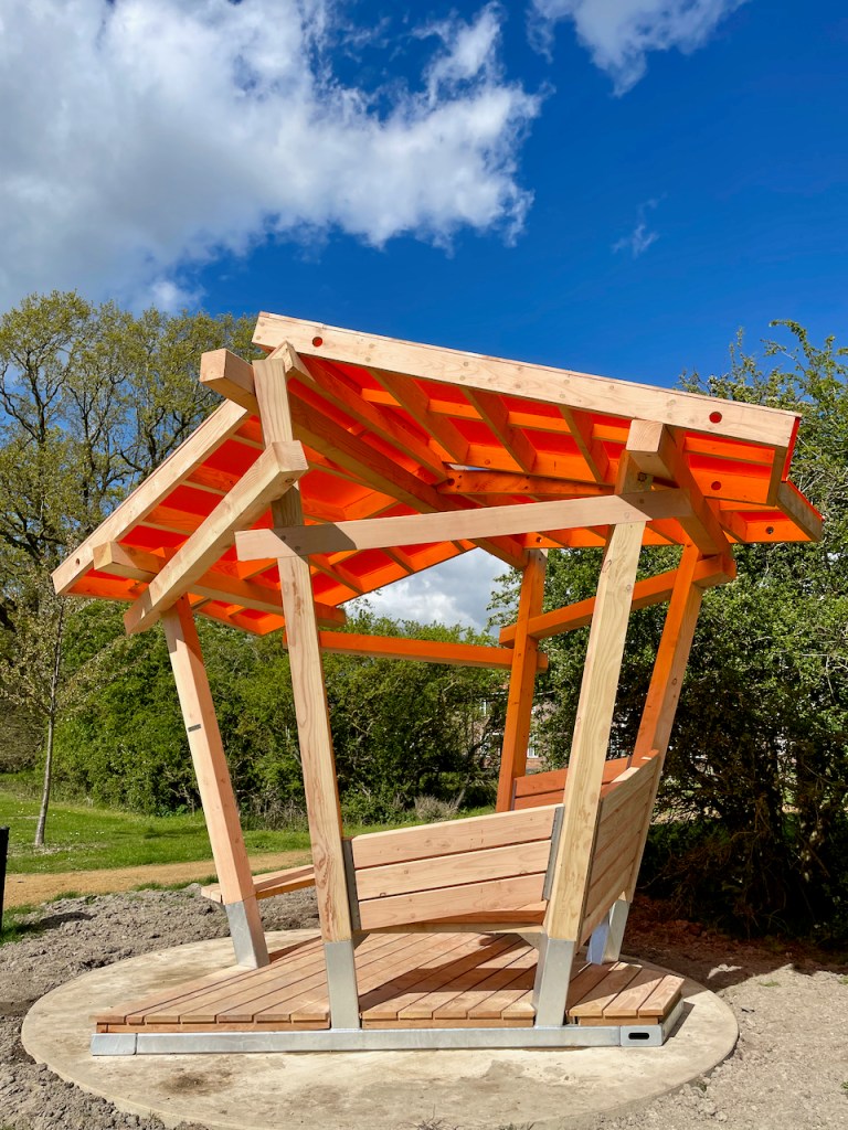 The roofs, as with the rest of the shelter are made with a Douglas Fir frame and then topped with coloured cast acrylic sheet. The previous ones we made had wildflower meadow roofs. Each panel could be a different colour but its hard to not fall in love with the burnt orange. Looking up at the roof leaves me with a Japanese screen flavour, and maybe the whole shelter has a bit of an oriental park pagoda vibe.