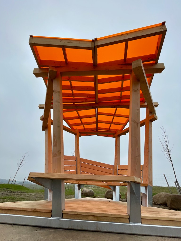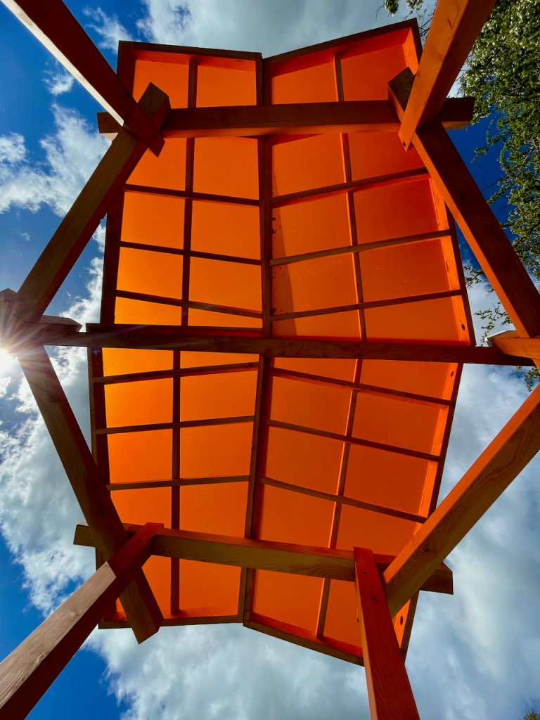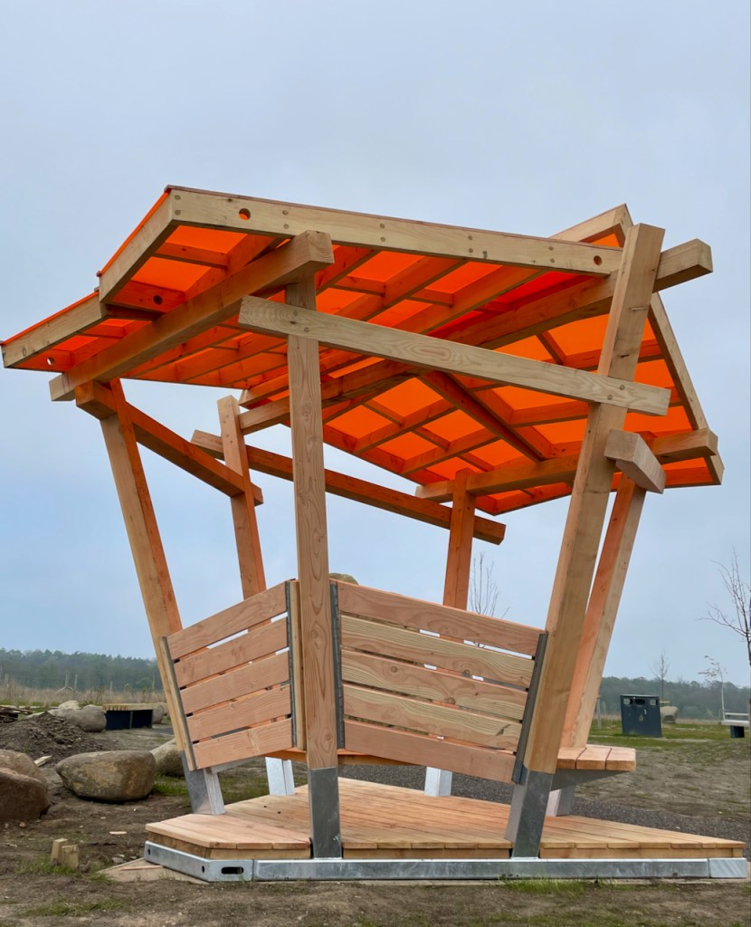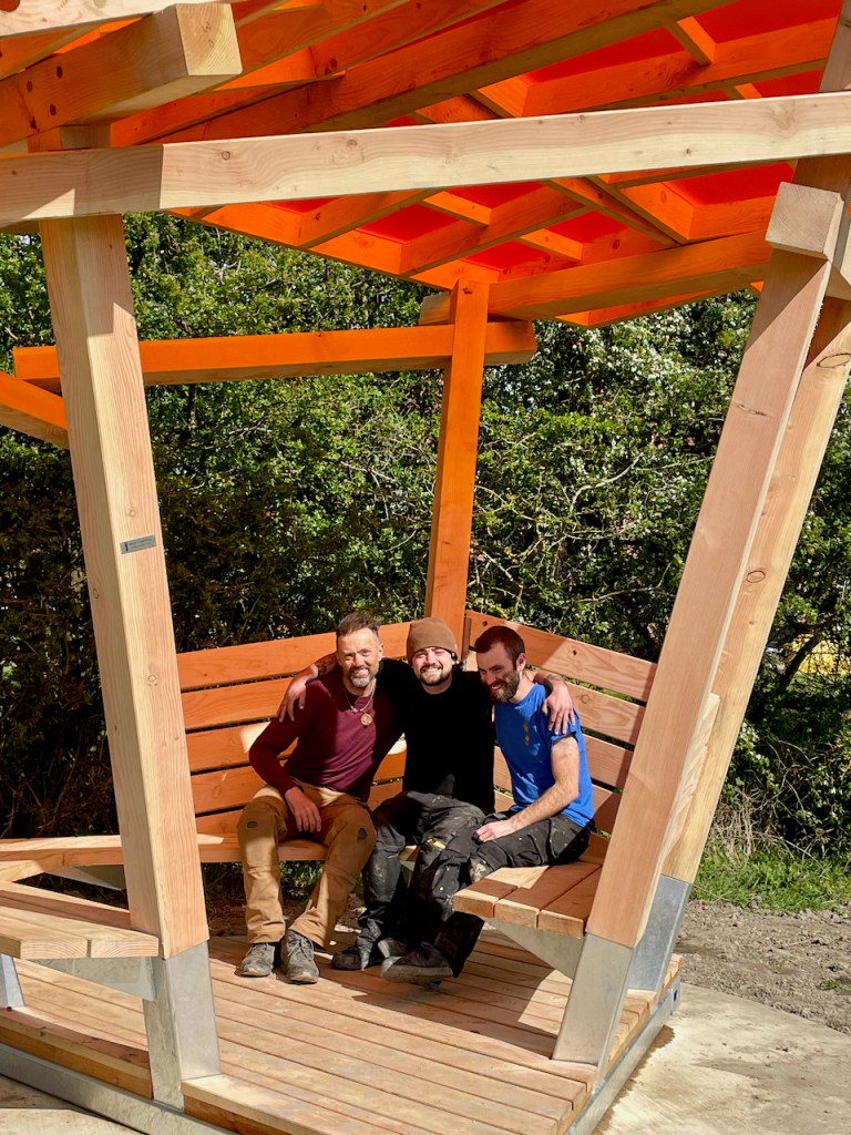 The roofs, as with the rest of the shelter are made with a Douglas Fir frame and then topped with coloured cast acrylic sheet. The previous ones we made had wildflower meadow roofs. Each panel could be a different colour but its hard to not fall in love with the burnt orange. Looking up at the roof leaves me with a Japanese screen flavour, and maybe the whole shelter has a bit of an oriental park pagoda vibe.