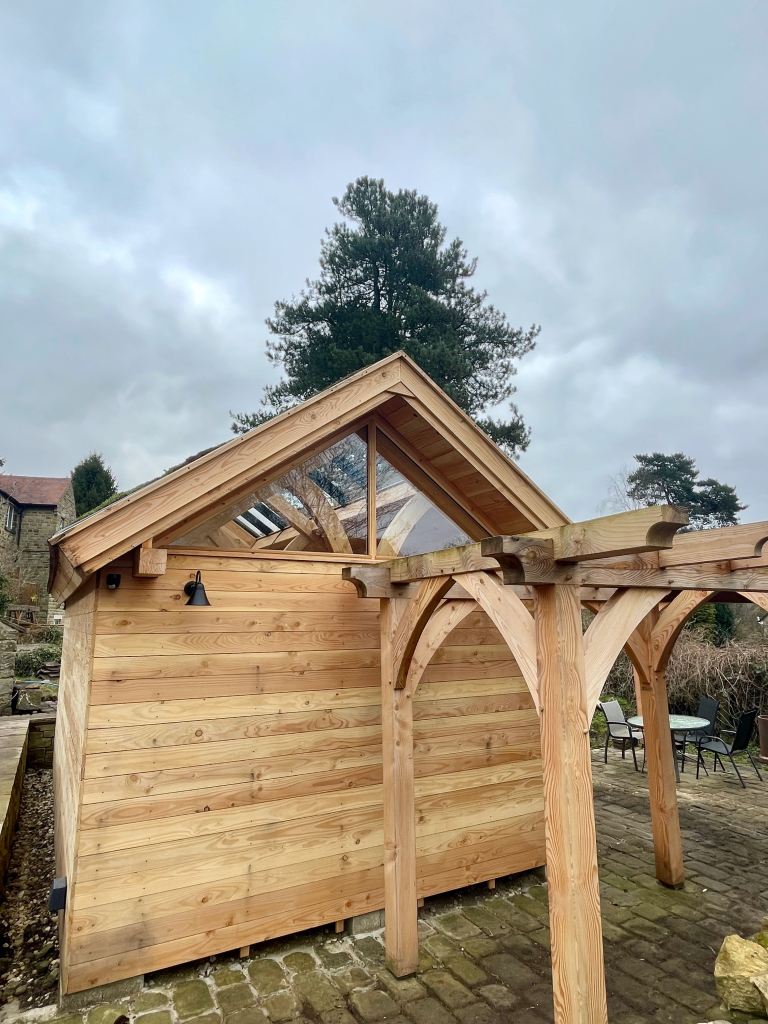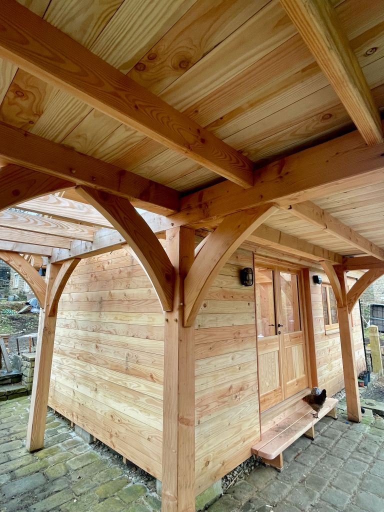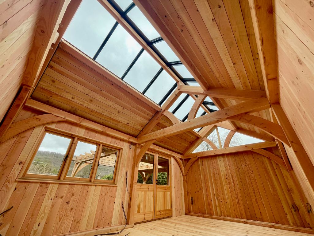 All timber UK grown Douglas Fir. Traditional timber frame with pegged mortise and tenon joints, visible on the inside with a super insulated clad exterior and triple glazed roof lights.