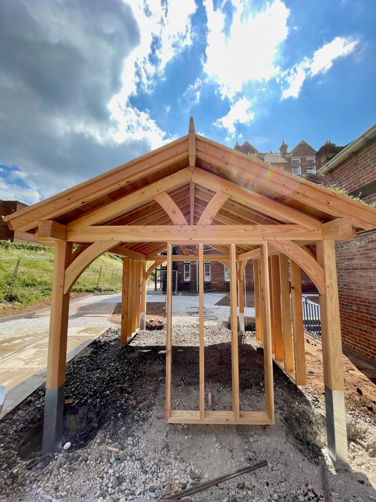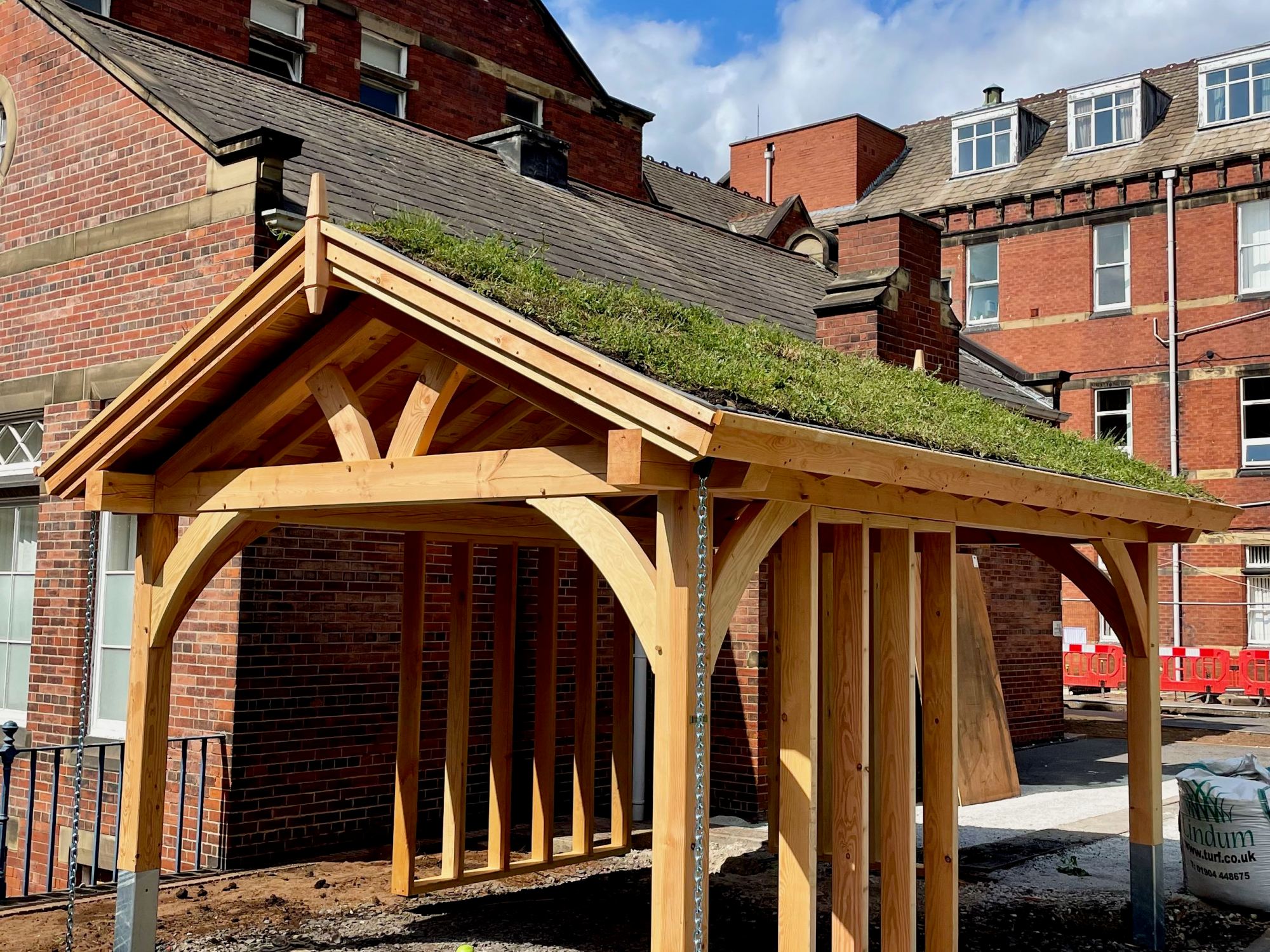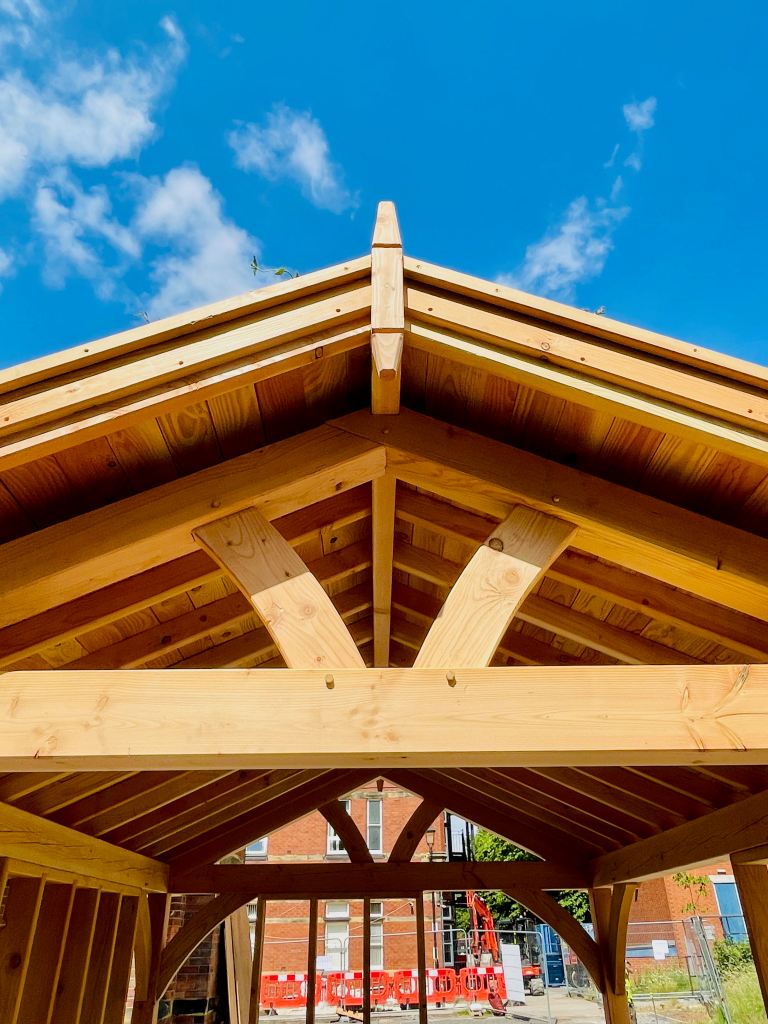 UK FSC Douglas Fir timber frame, traditionally jointed and draw dowelled. Wildflower greenroof and drain chains.