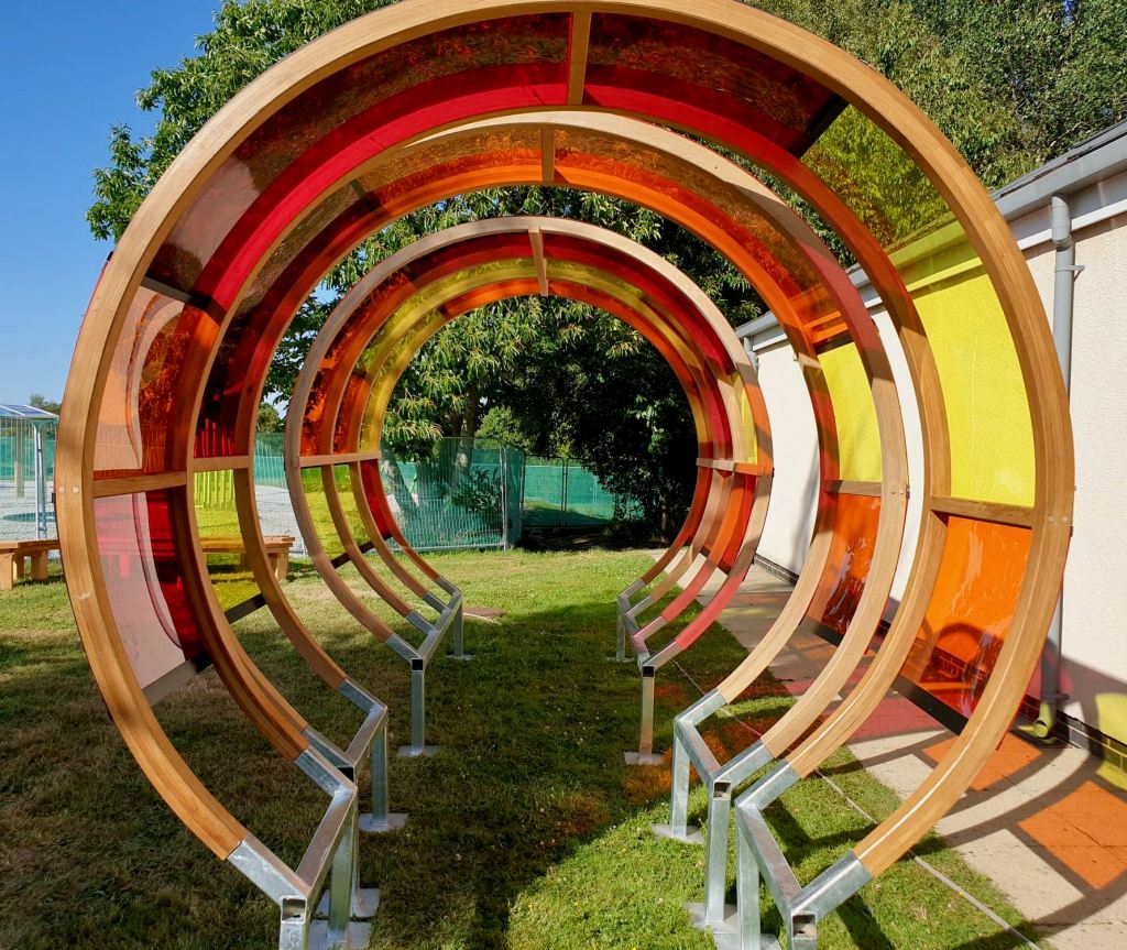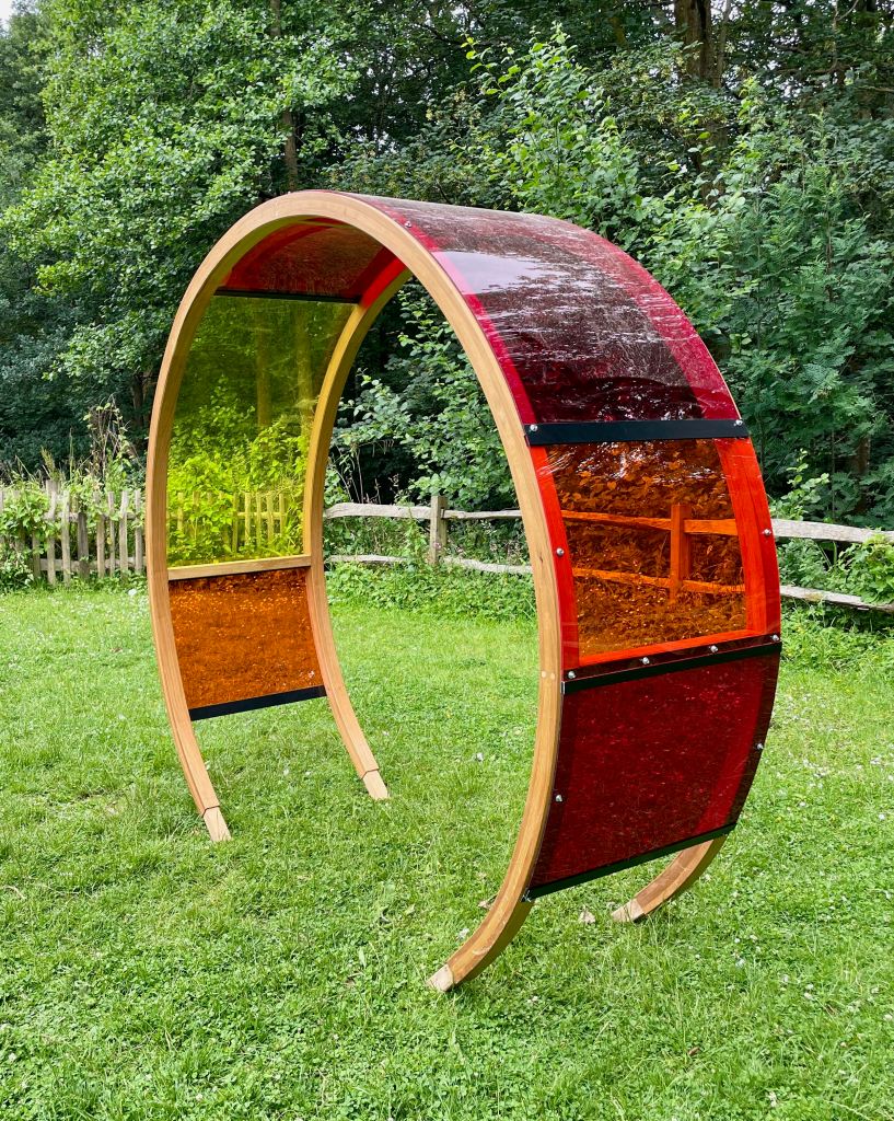 Moon Portal entranceways and a longer tunnel for a children’s hospice garden in Shropshire. Made from glue laminated Oak hoops with coloured perspex and galvanised steel base supports. Delivered along with five curved benches. Hopefully we will be able to add some pictures of everything installed into the finished garden, and also be involved in the next, woodland stage of the project.