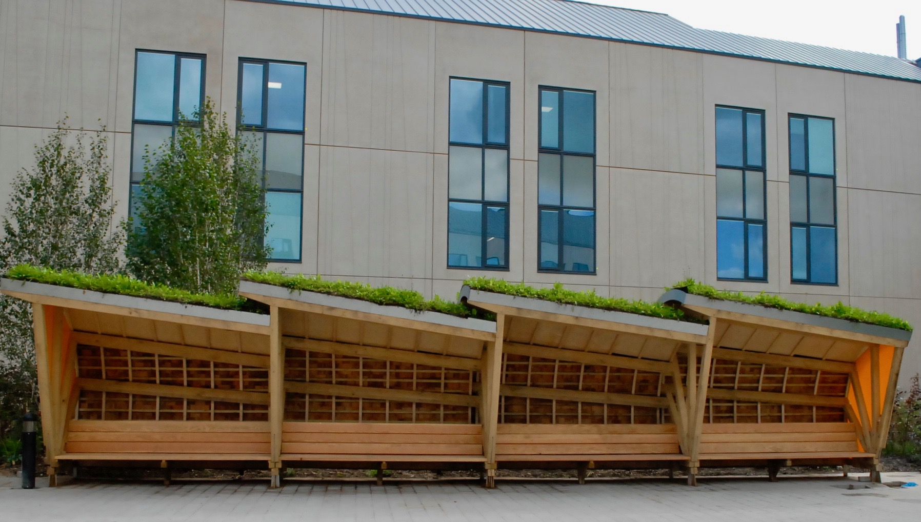 Galvanized steel structure, air-dried English Oak detailing, stainless steel fixings