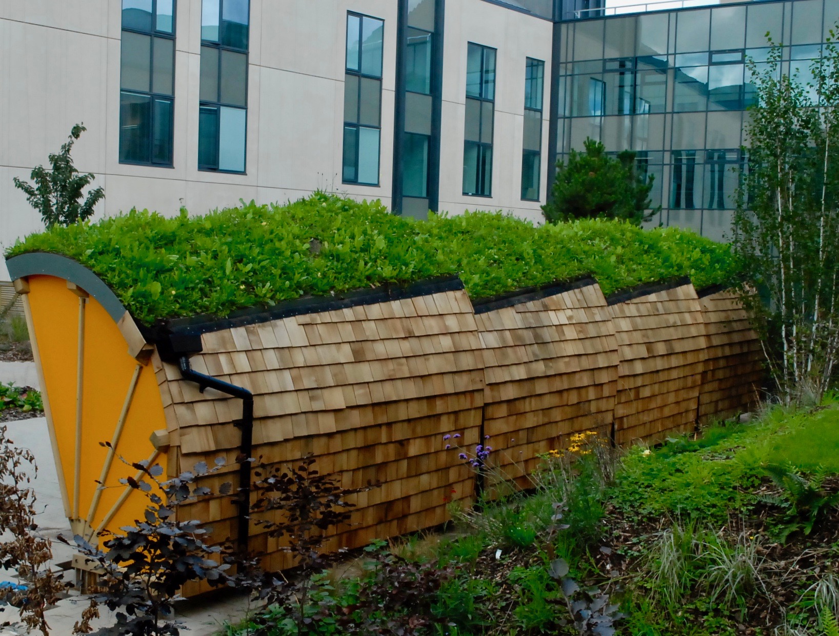 Galvanized steel structure, air-dried English Oak detailing, stainless steel fixings